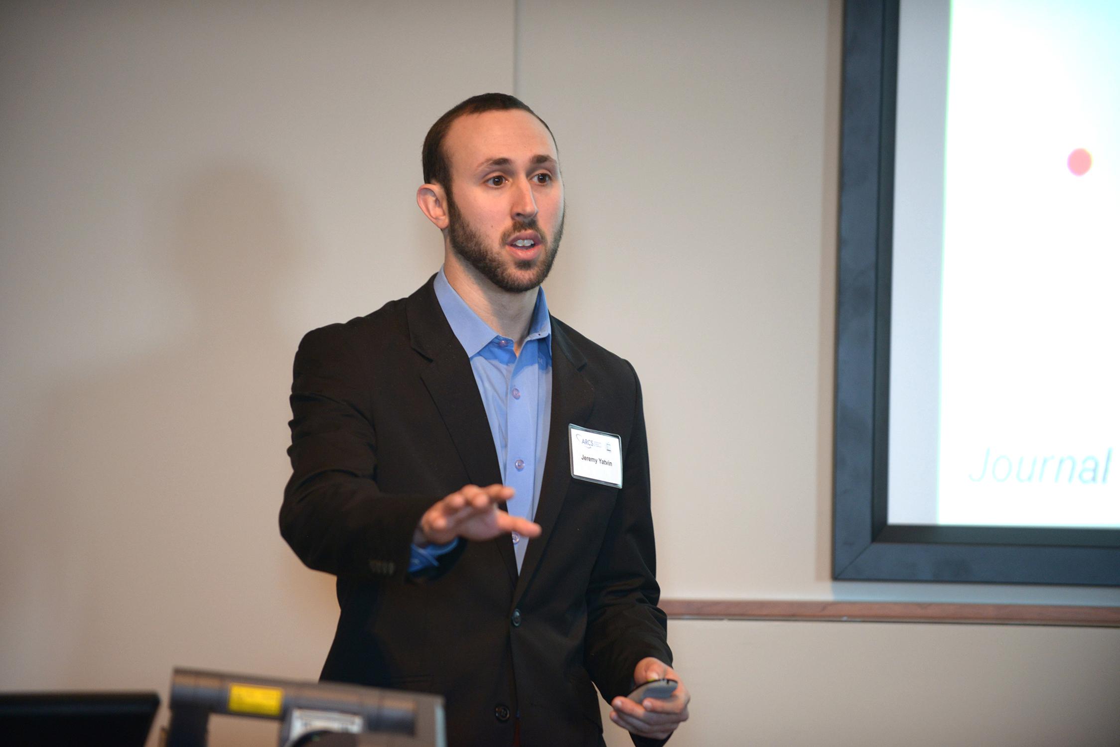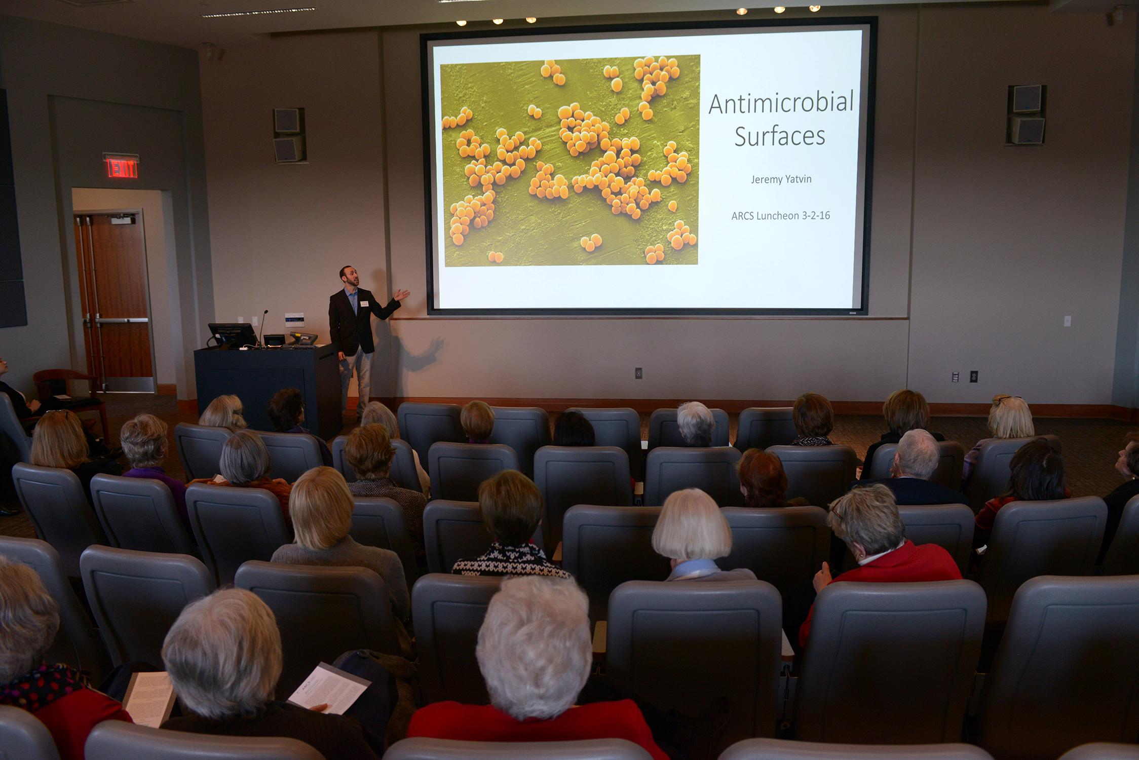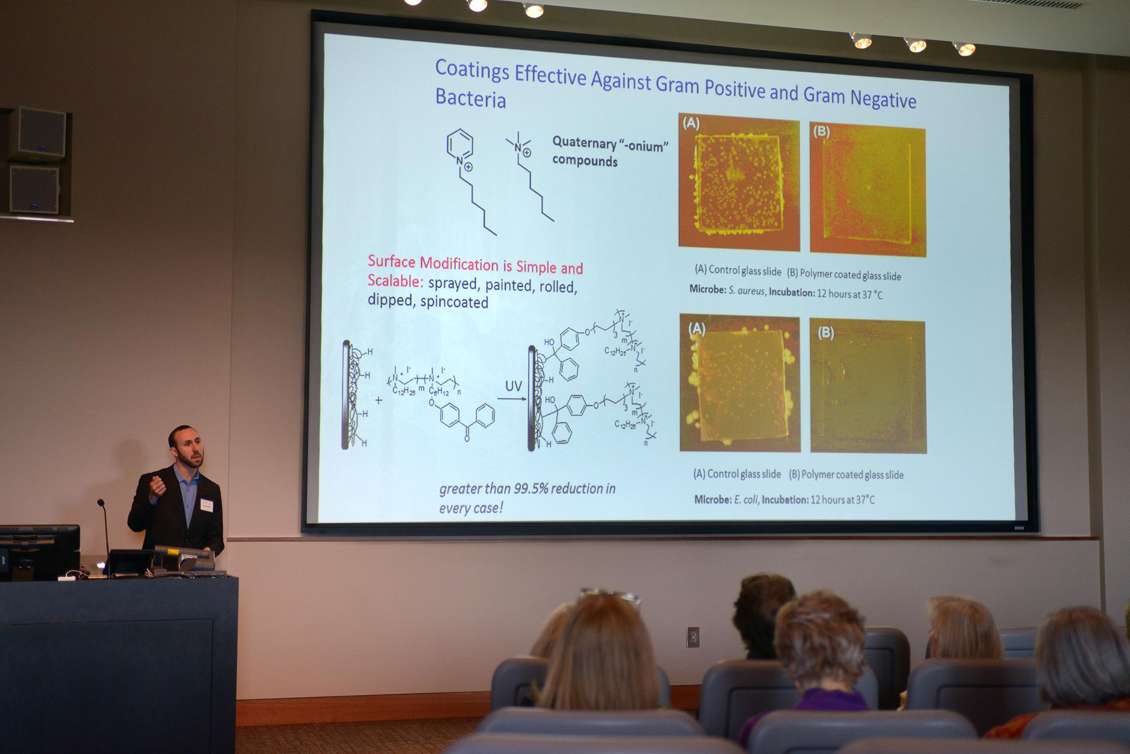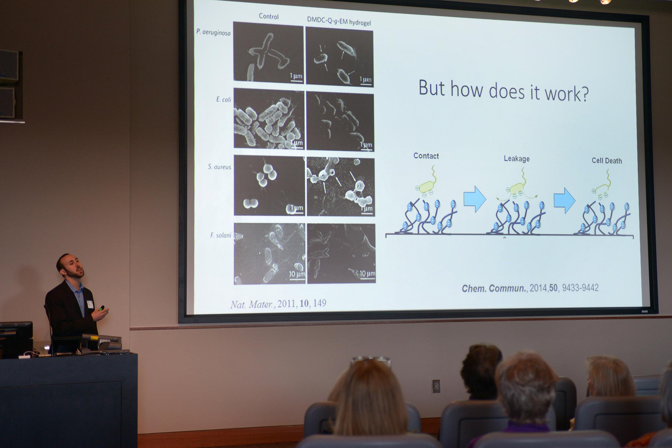 Jeremy Yatvin, a Ph.D. candidate in Chemistry, introduced his work on antimicrobial surfaces and their mechanism of action, as well as the grafting of fire retardant materials.